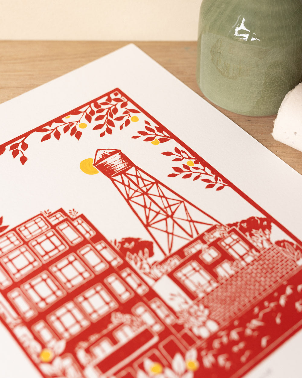 Greenpoint is my neighborhood, a place that has become very dear to me. It’s calm, full of good energy, and wrapped in the perfect mix of city and nature. This handmade three-color linoprint captures a view from the river, where the iconic Greenpoint water tower stands tall above the rooftops. A residential building sits nearby, tucked into rich foliage that makes the whole scene feel almost like a jungle.