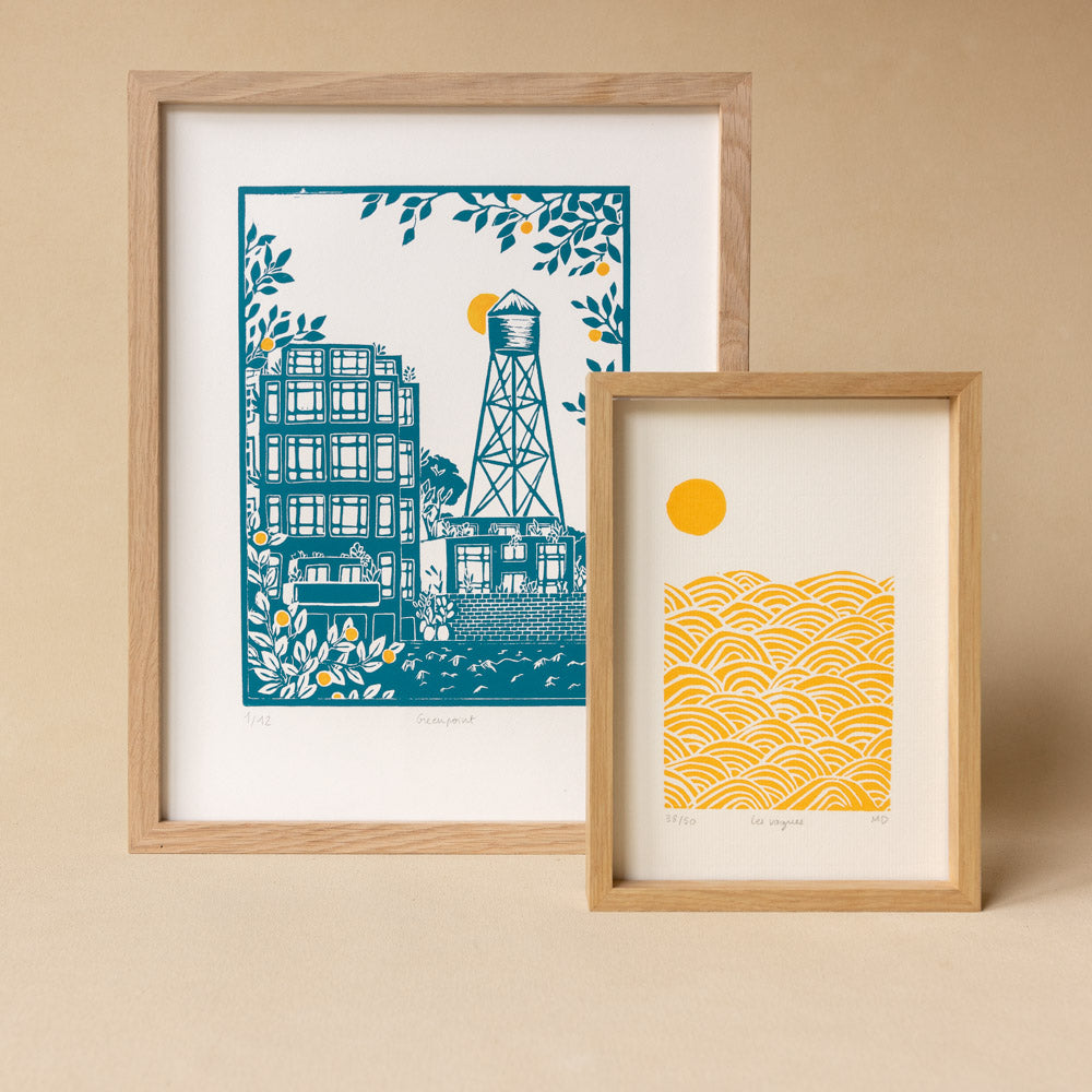 Each print carries the unique textures of the linocut process, making every piece one of a kind.