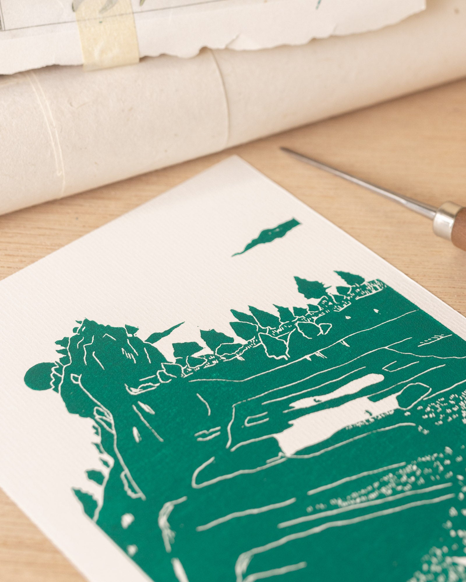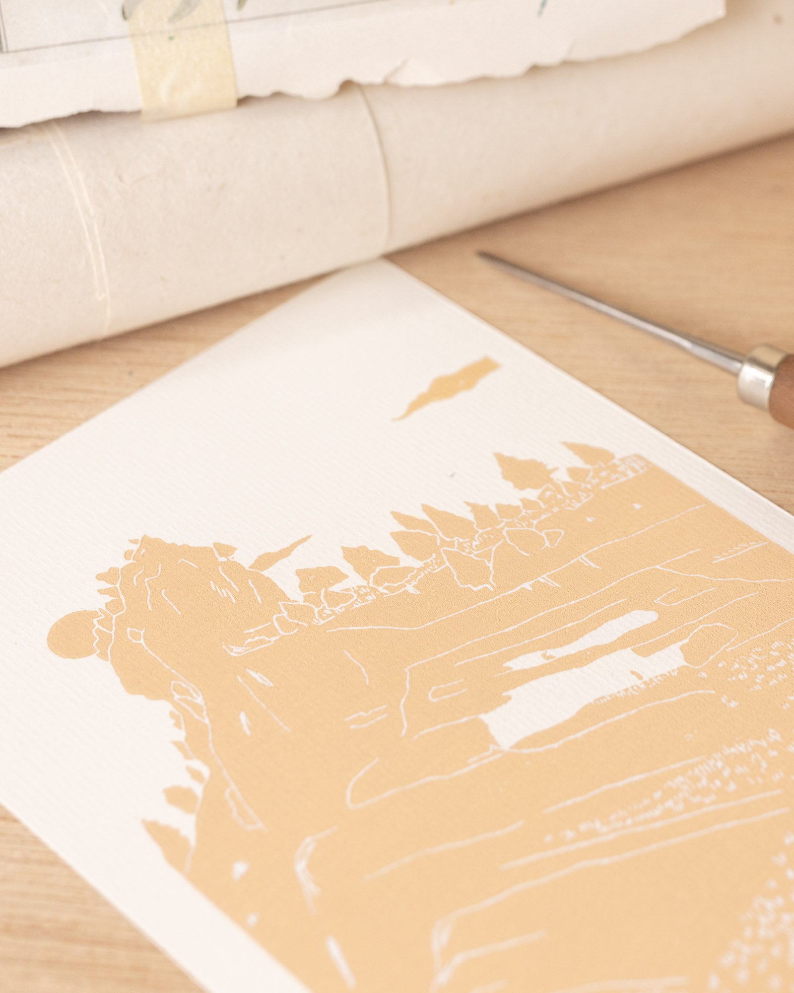 Each print carries the unique textures of the linocut process, making every piece one of a kind.