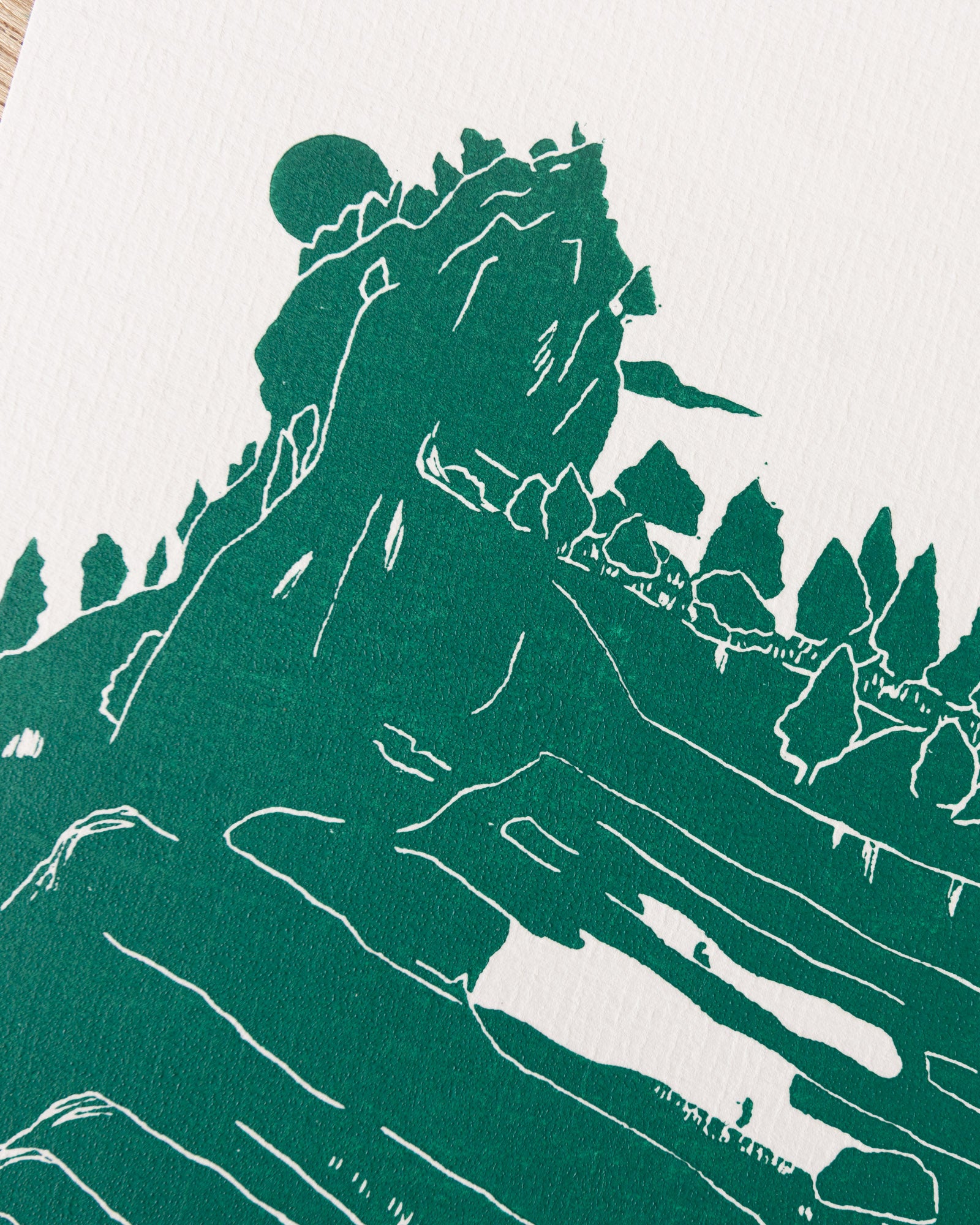 This handmade monochrome linoprint shows La Tour Isabelle, a striking natural arch nestled in the French Alps. It’s the kind of place that feels quietly grand, a narrow path winding through wildflowers and silence, until the trail opens onto this high stone window carved by time.