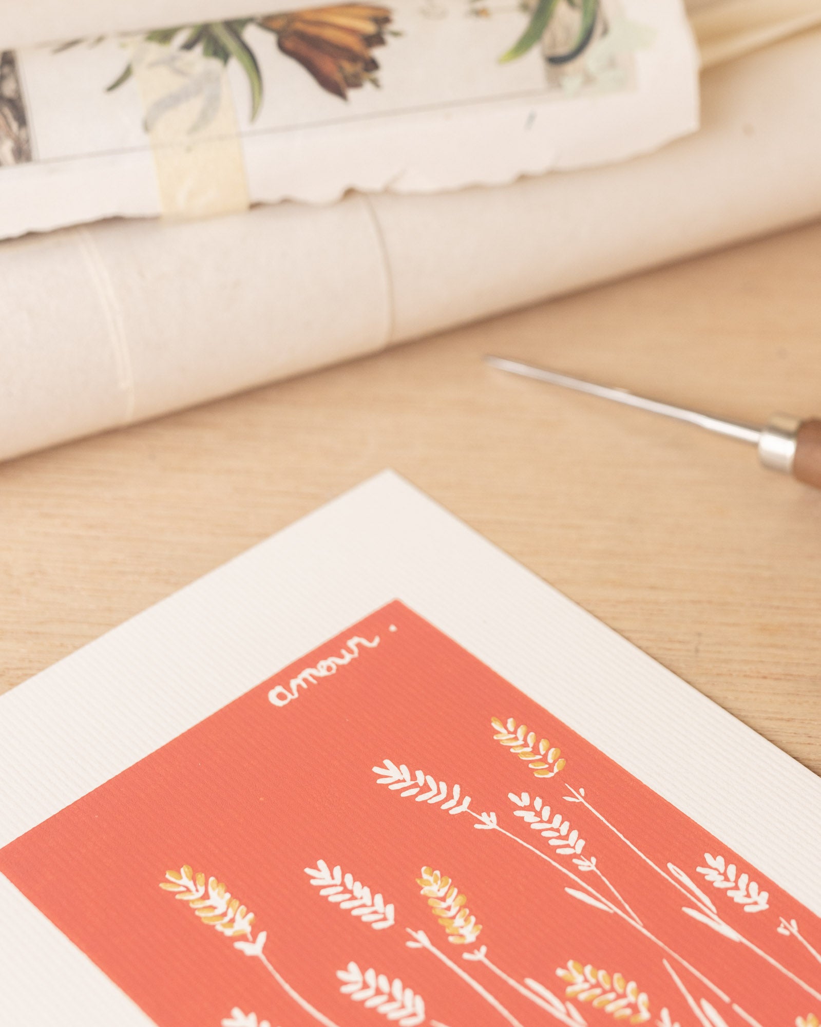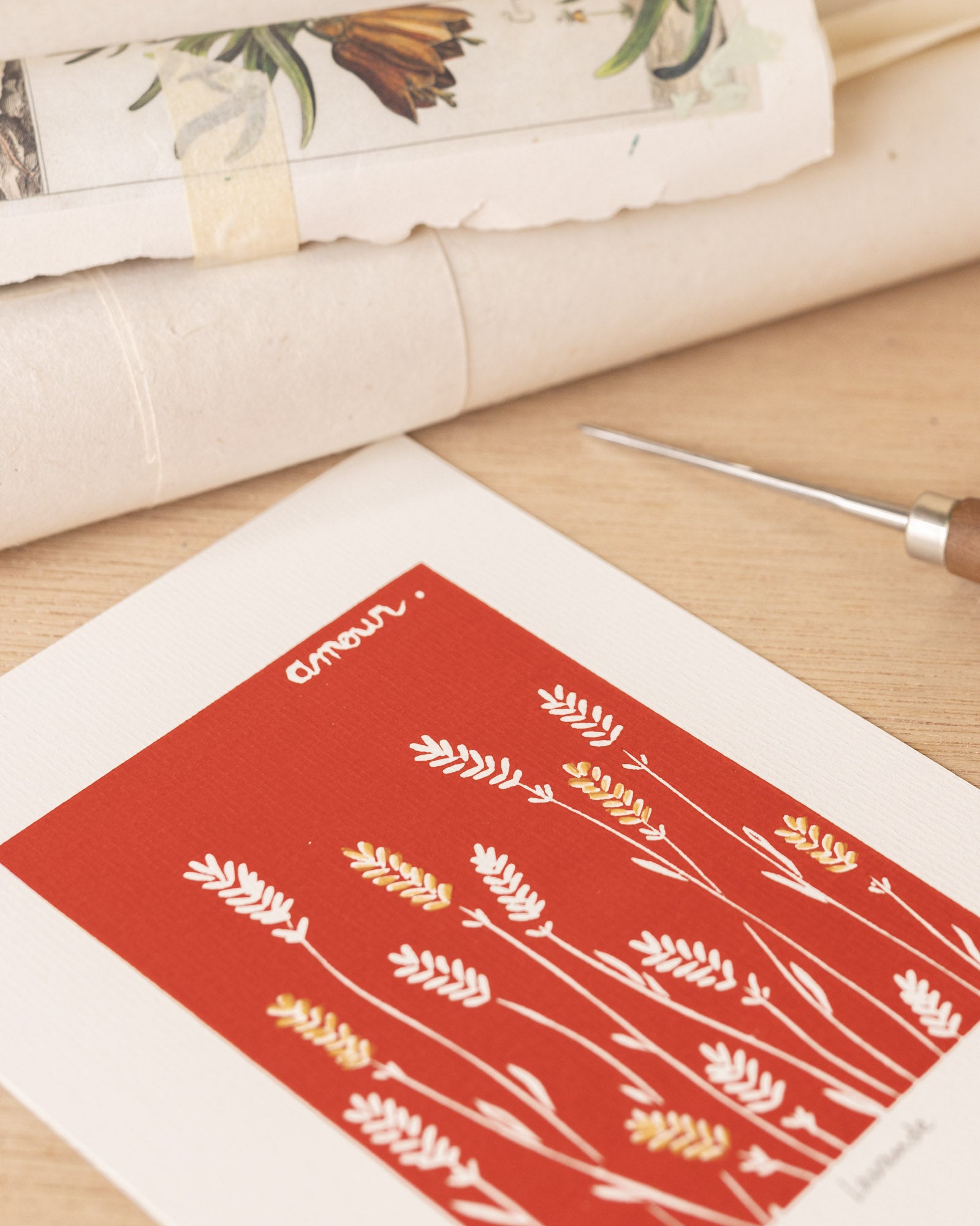 Each print carries the unique textures of the linocut process, making every piece one of a kind.