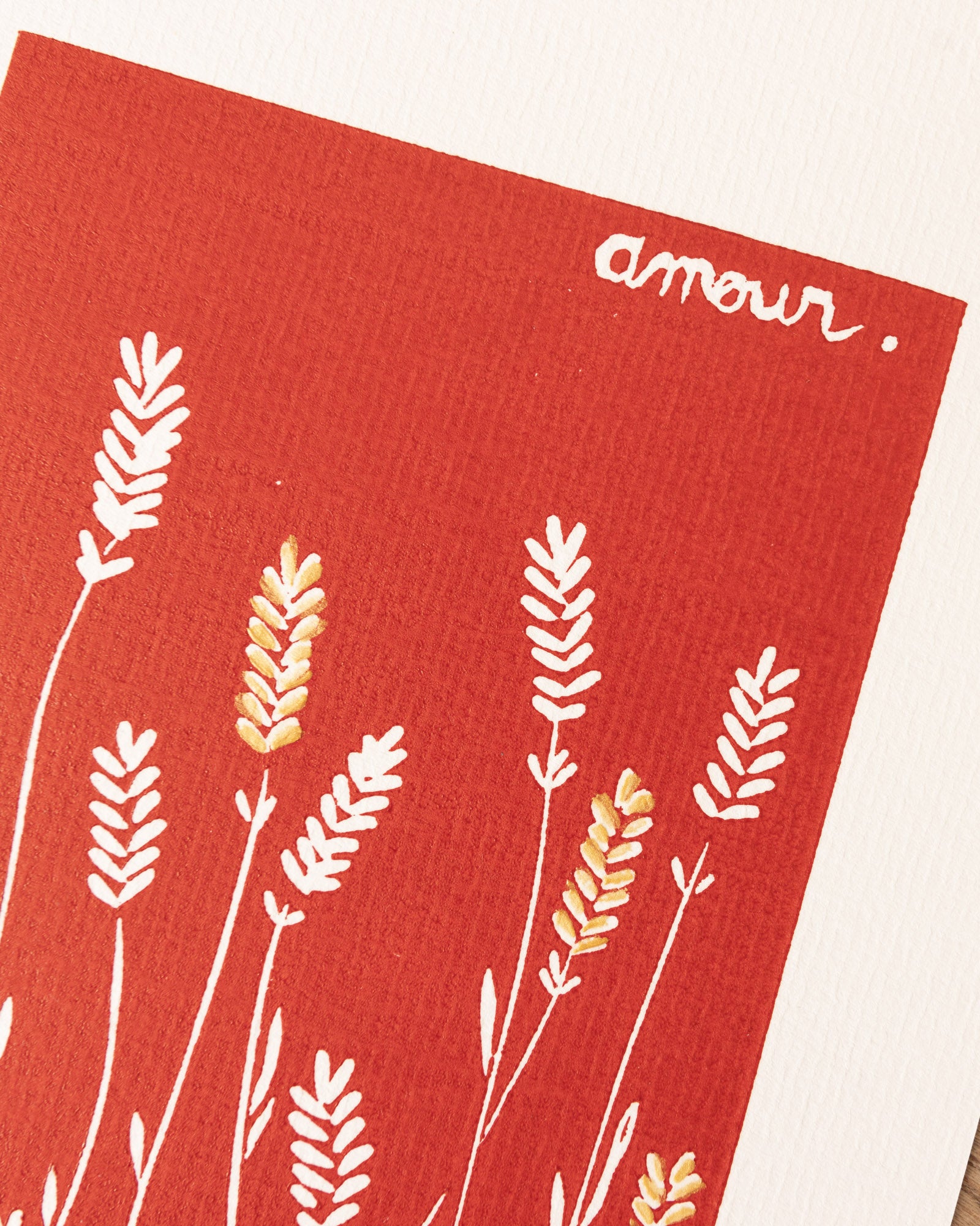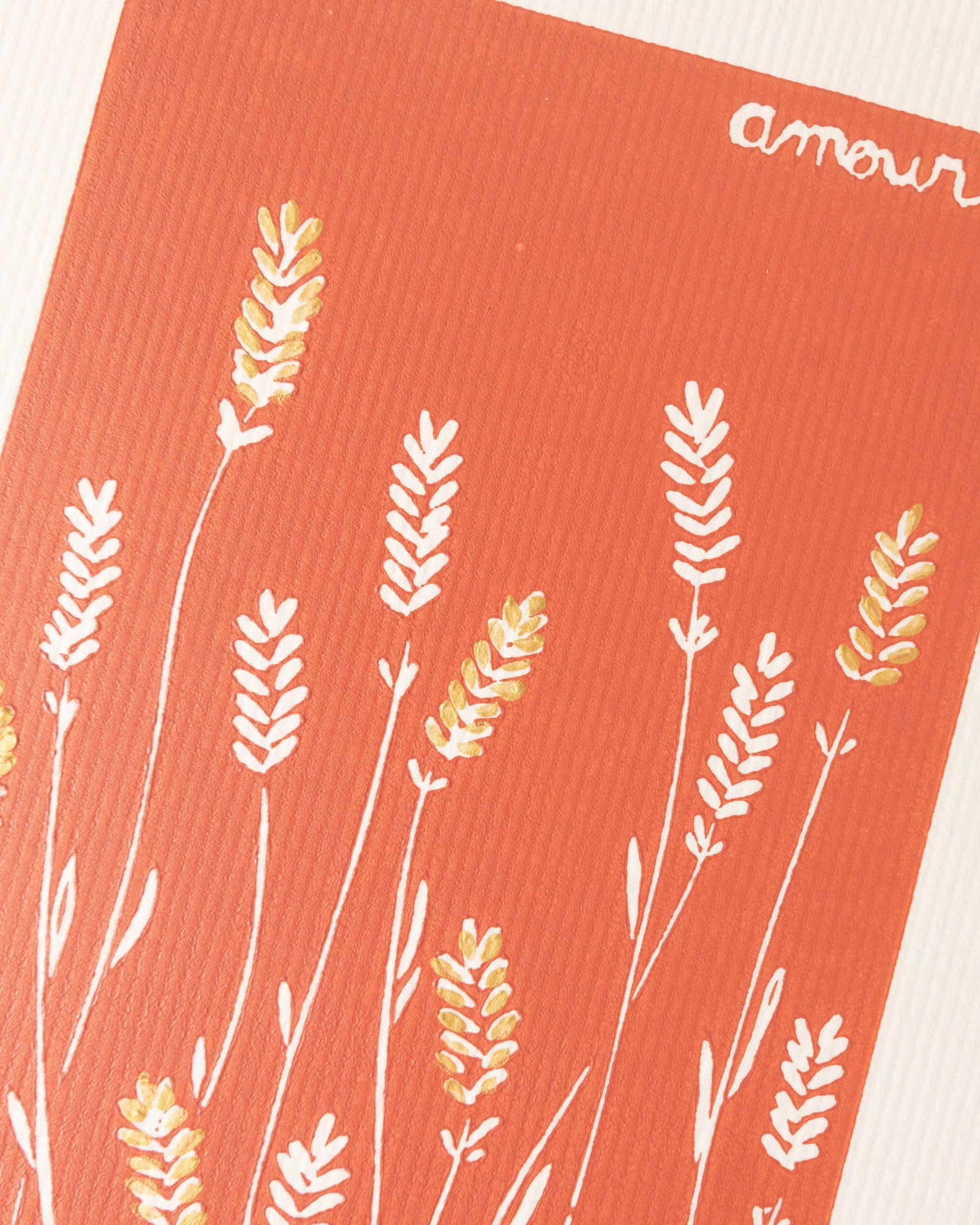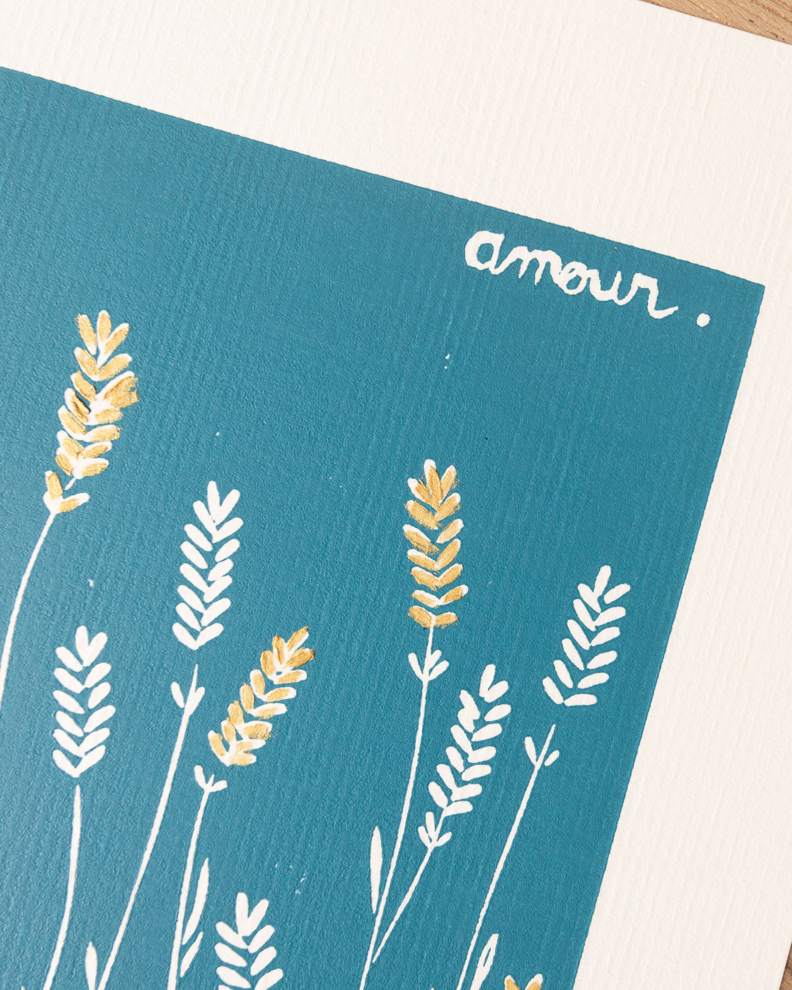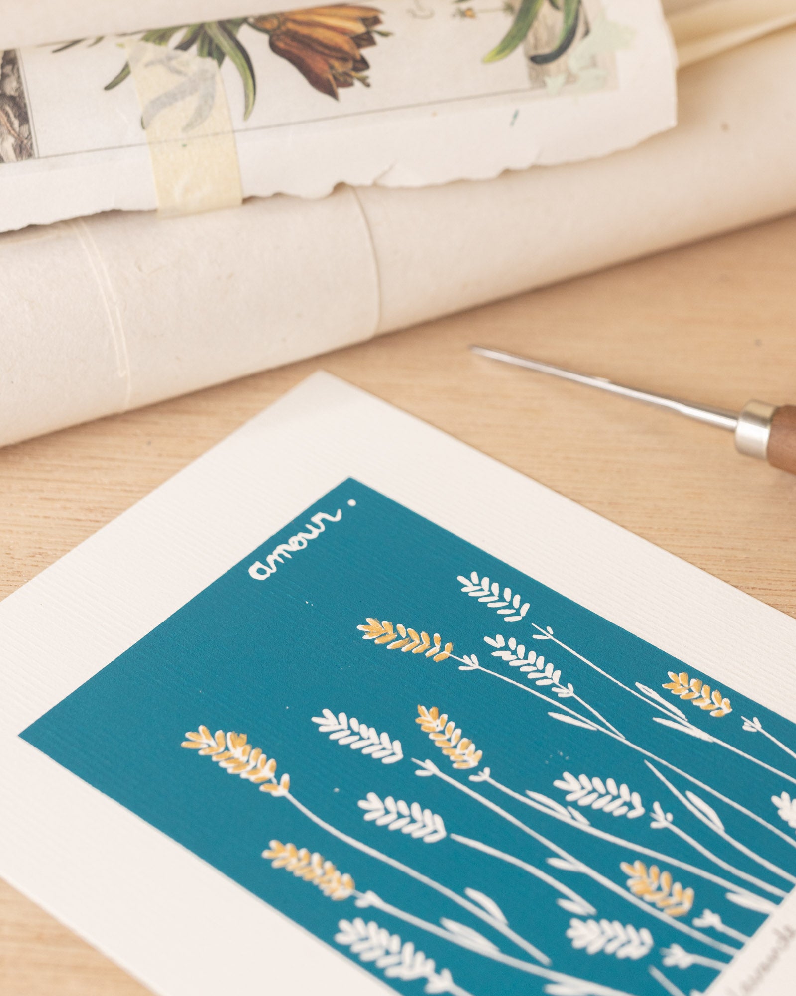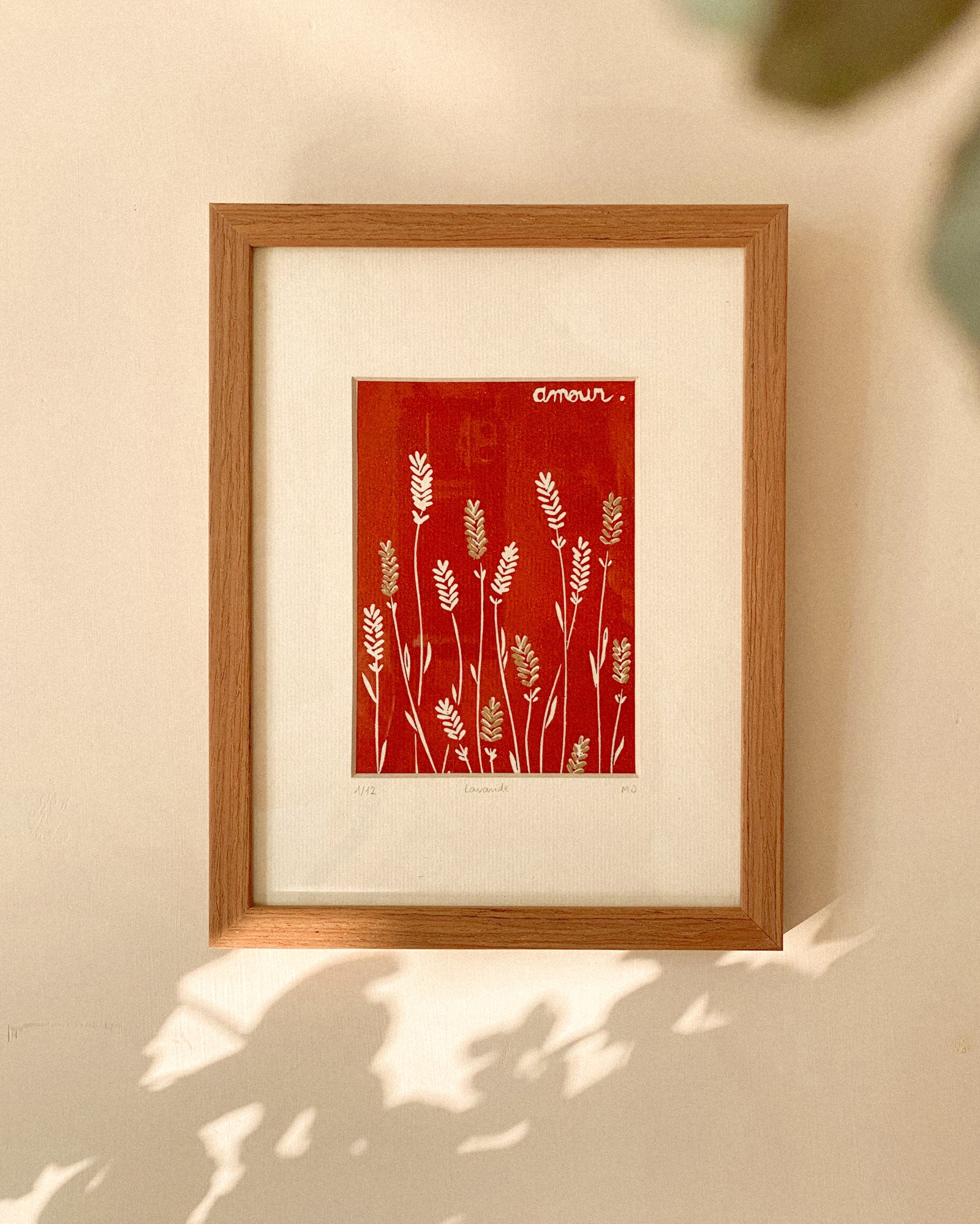 This handmade linoprint shows delicate lavender blooms standing against a solid background. Fine golden details add a soft glow, catching the light like the last sun of the day.