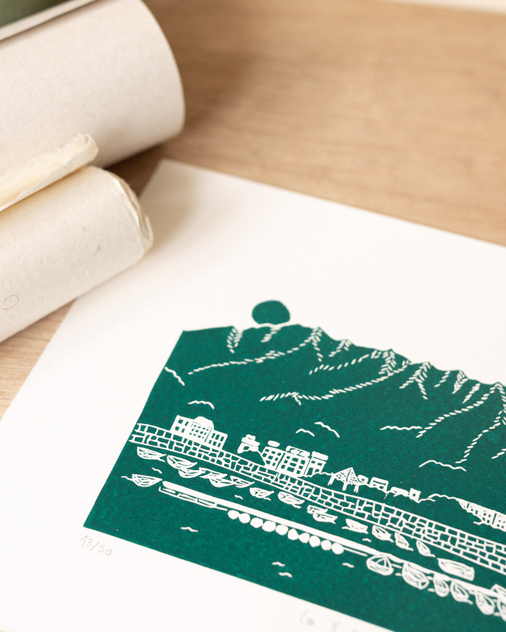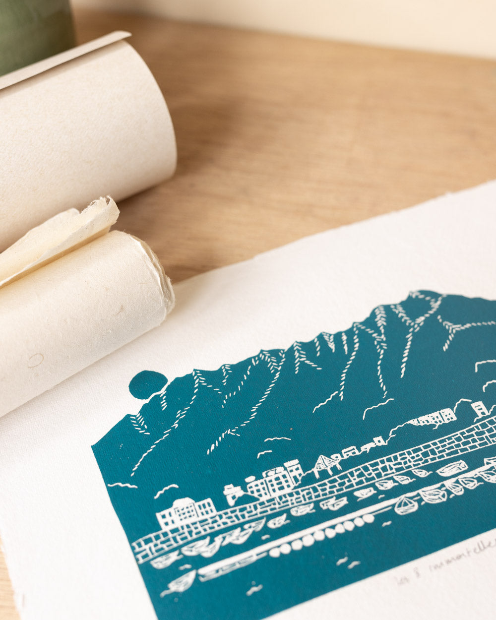 Each print carries the unique textures of the linocut process, making every piece one of a kind.