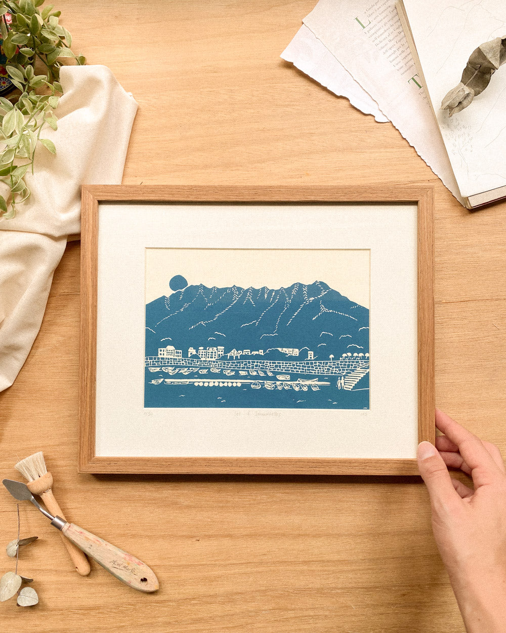 This handmade monochrome linoprint captures the view from the sea toward Les 8 Immortelles, a striking mountain range rising above the small fishing village of Tai Mei Tuk. The contrast between the stillness of the water, the simple village life below, and the grandeur of the peaks above evokes the balance between nature and tradition in Hong Kong.