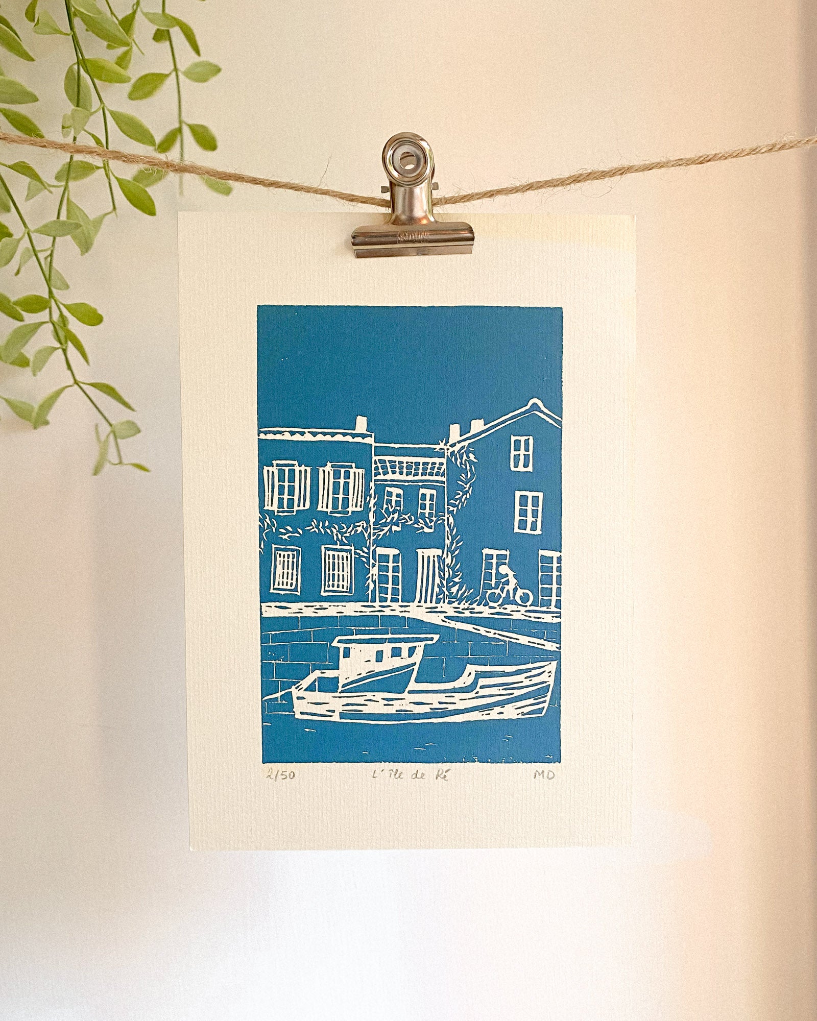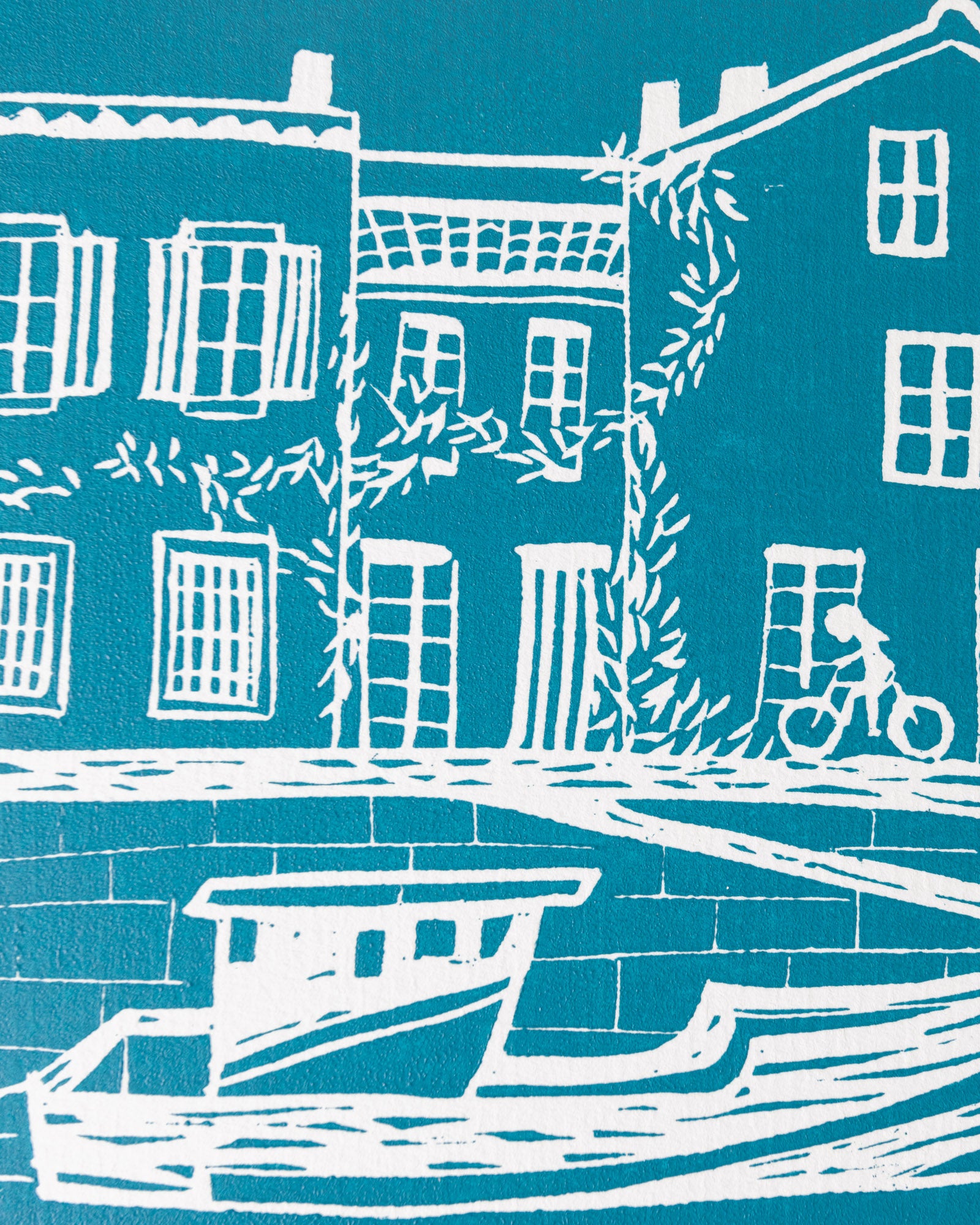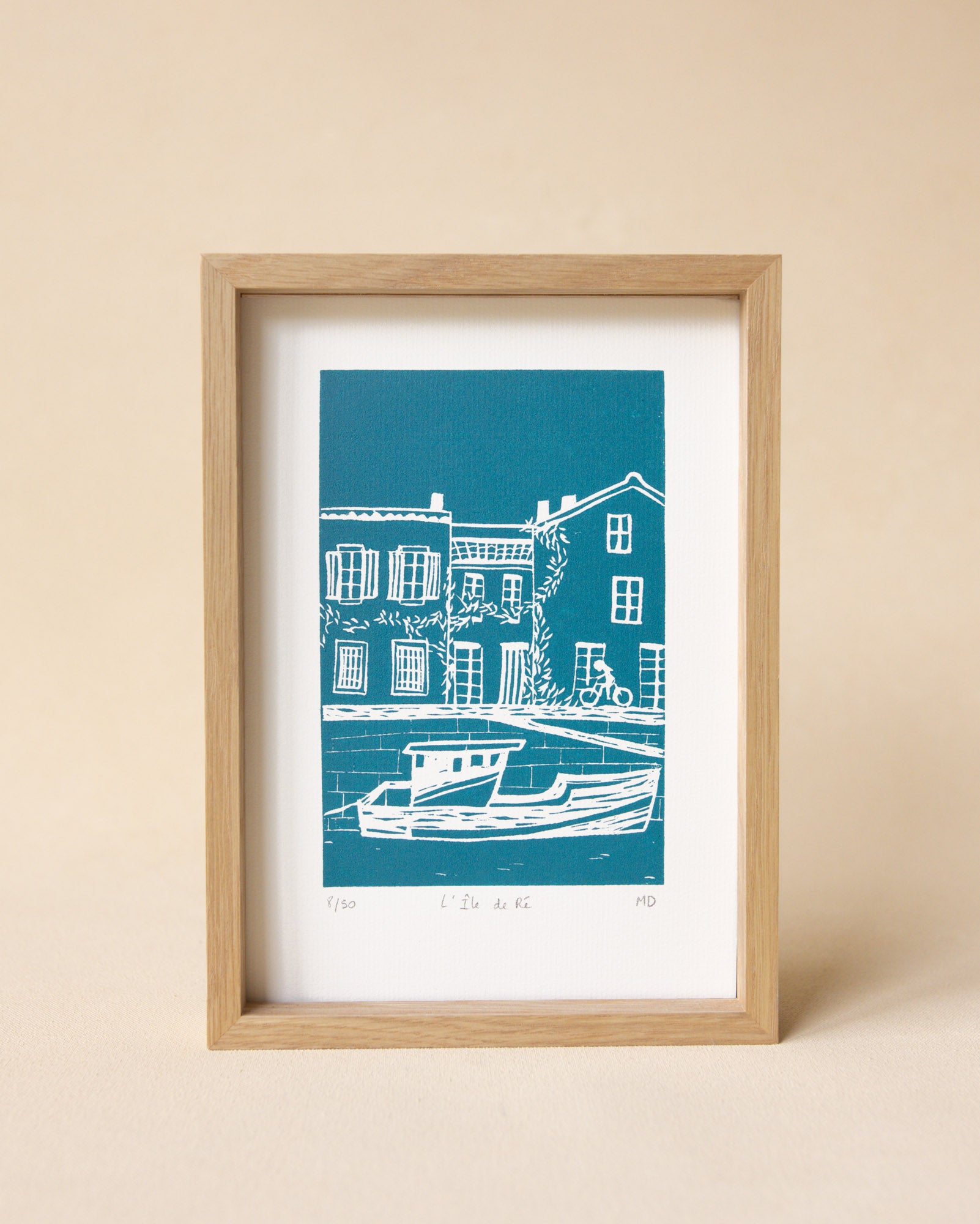 This handmade monochrome linoprint shows a moment from La Flotte, one of my favorite ports on Île de Ré. A boat rests gently in the harbor, with the soft outlines of village houses behind. A girl rides by on her bike, just like we used to in the summer.