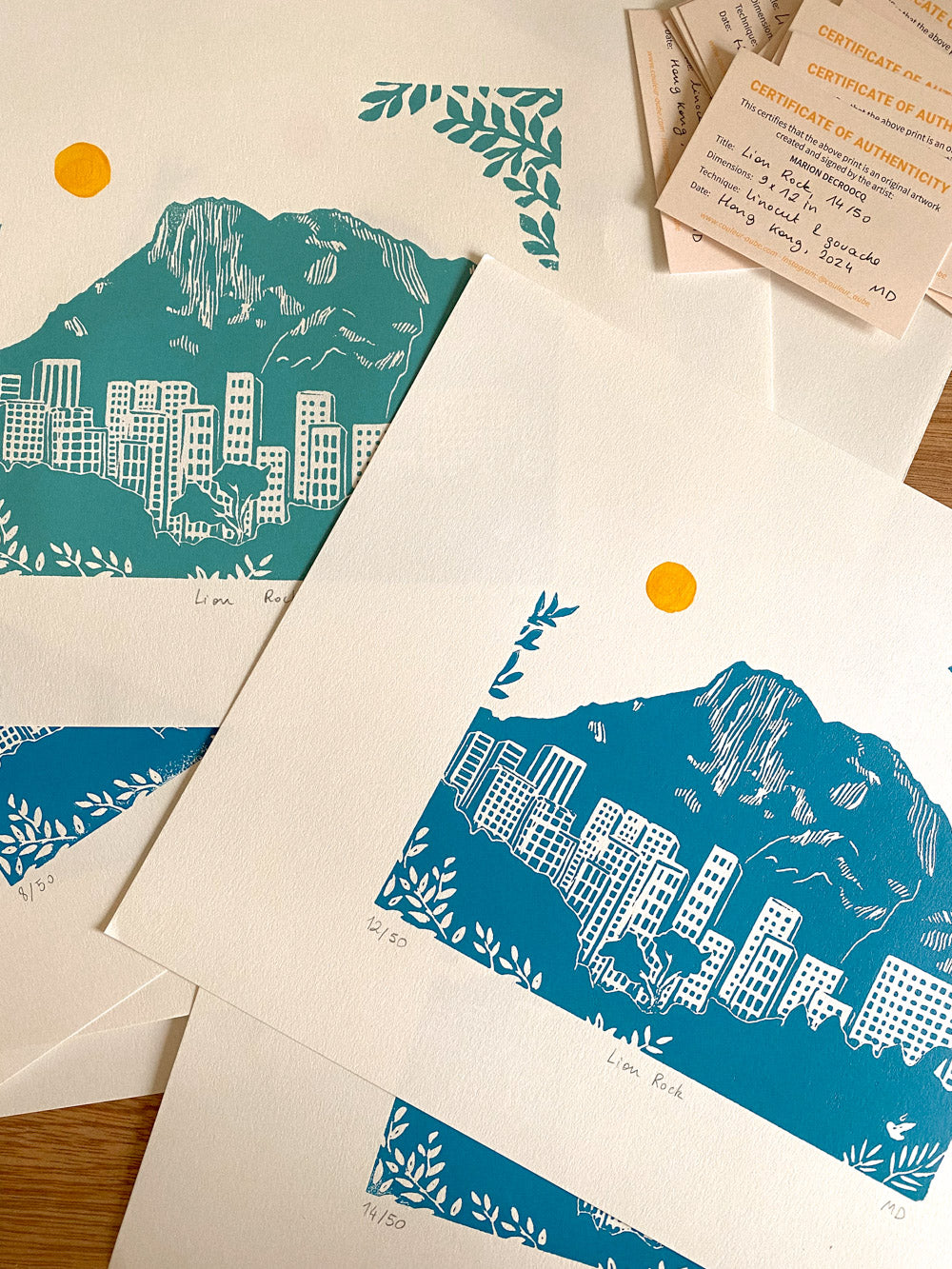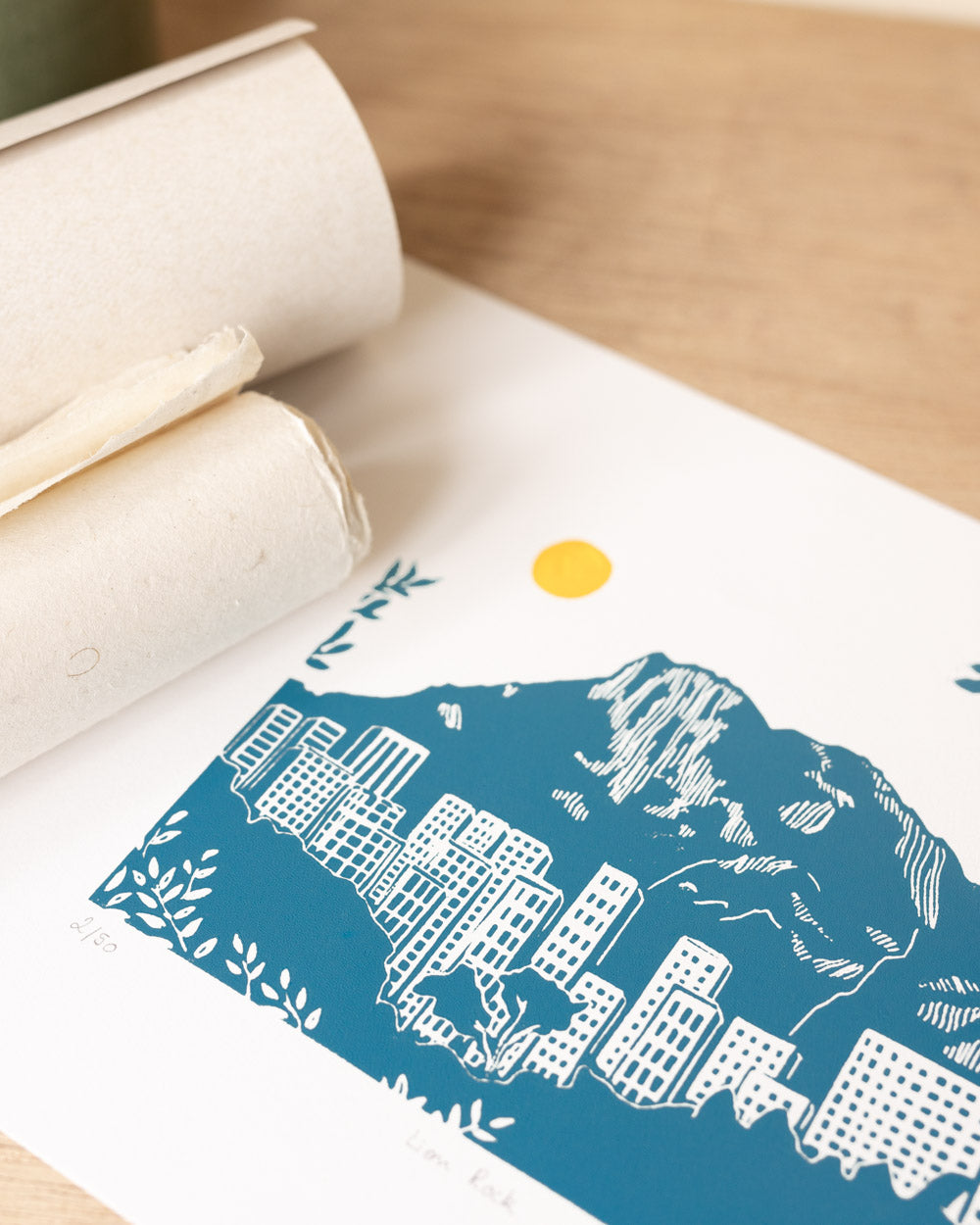 This handmade linoprint captures a striking front view of Lion Rock, one of Hong Kong’s most iconic mountains. In the foreground, high-rise buildings rise in rigid formation, a sharp contrast to the raw, untamed rock towering behind them. The mountain watches over the city, a symbol of resilience and strength.