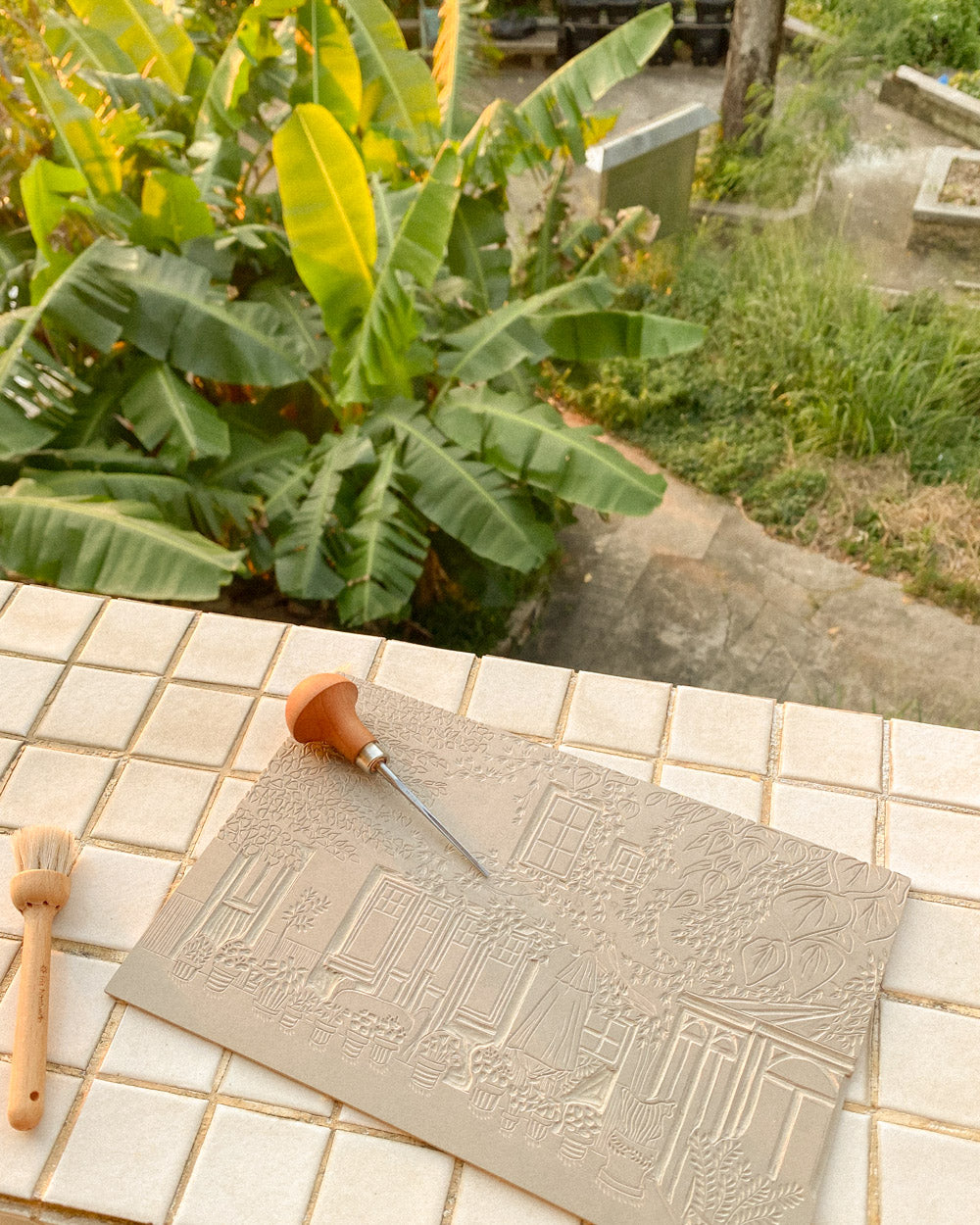 Each print carries the unique textures of the linocut process, making every piece one of a kind.